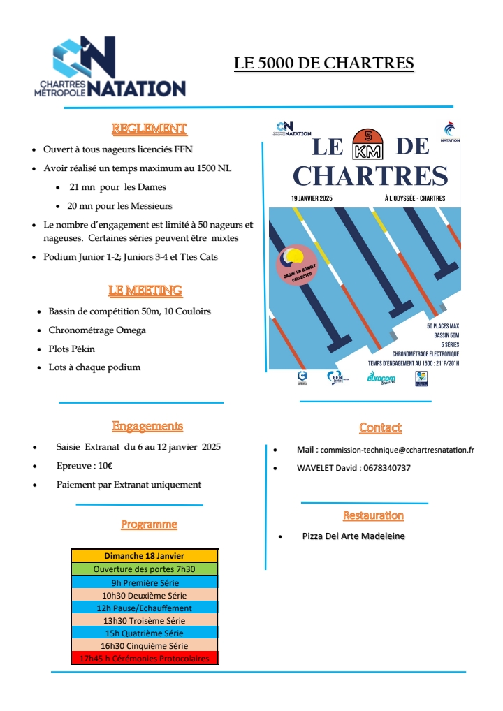 Nous organisons pour la deuxième année les 5000m de Chartres en bassin de 50m intérieur le 18 janvier 2026.